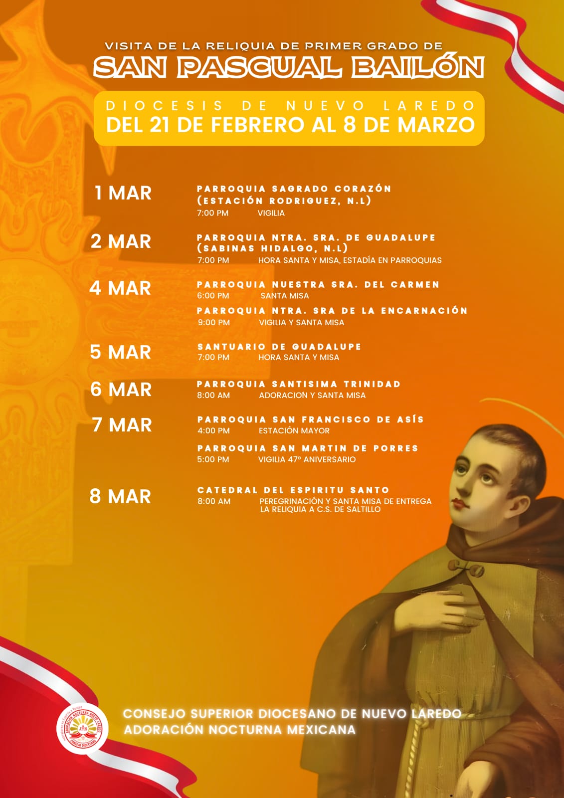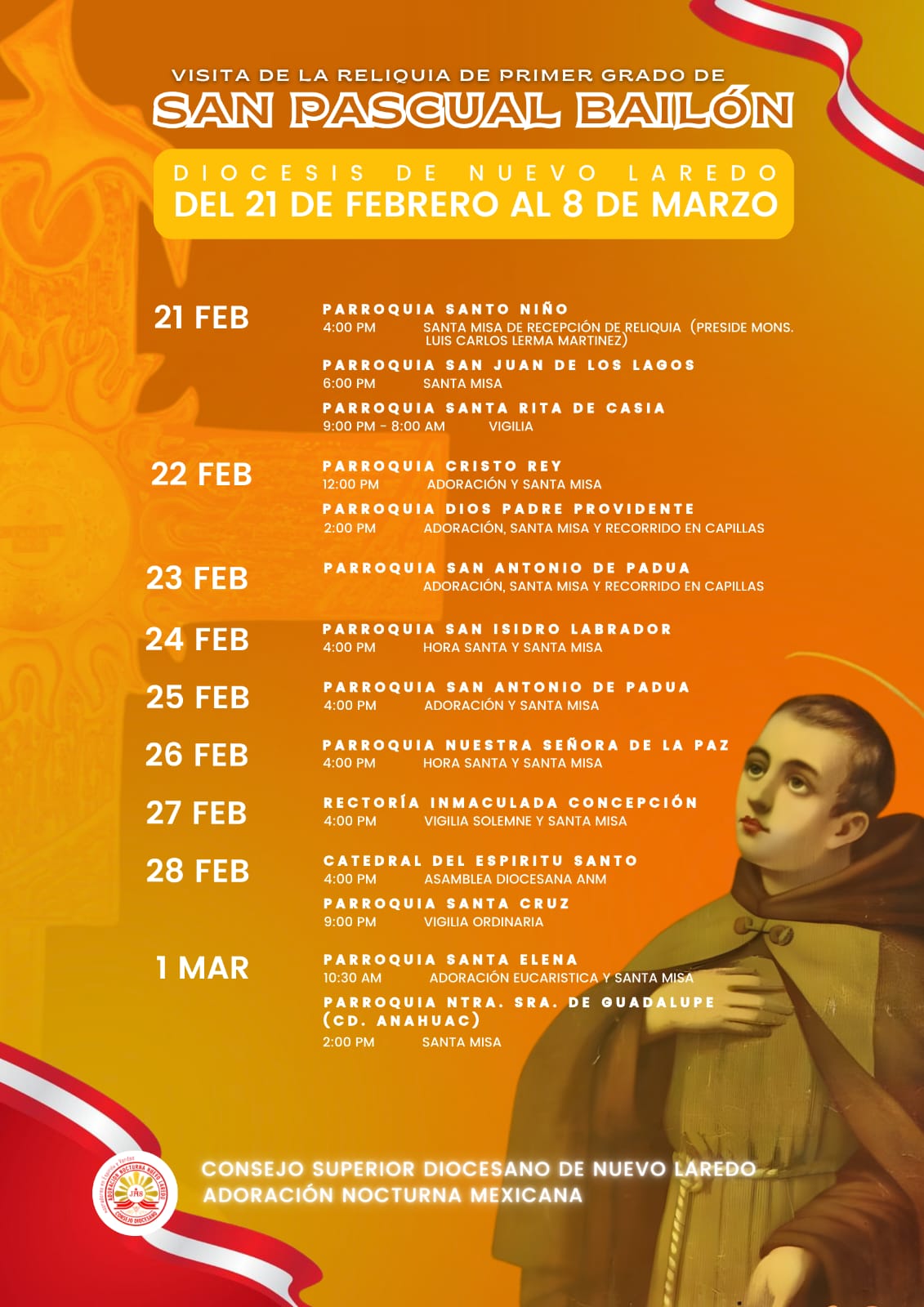 Del 21 de febrero al 8 de marzo de 2026 la Diócesis de Nuevo Laredo recibirá la visita de las reliquias de San Pascual Bailón, un acontecimiento de profundo significado religioso para la comunidad católica local y regional. Estas reliquias forman parte de un recorrido pastoral que ya ha pasado por diversas ciudades del país y que tiene por objetivo fortalecer la fe y promover encuentros de oración, celebraciones eucarísticas y actos de devoción en varias parroquias de nuestra diócesis.